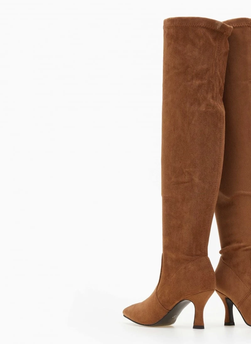 Μπότες μυτερές από suede με χαμηλό τακούνι. Είναι πάνω από το γόνατο και εσωτερικά κλείνουν με φερμουάρ.