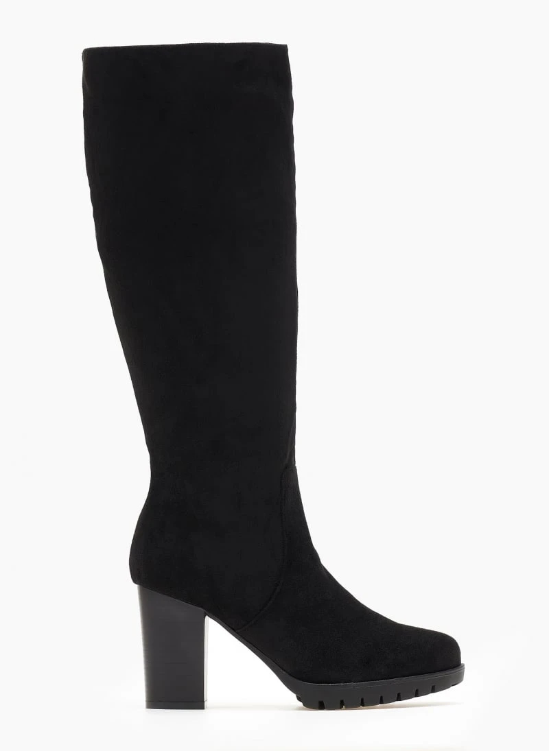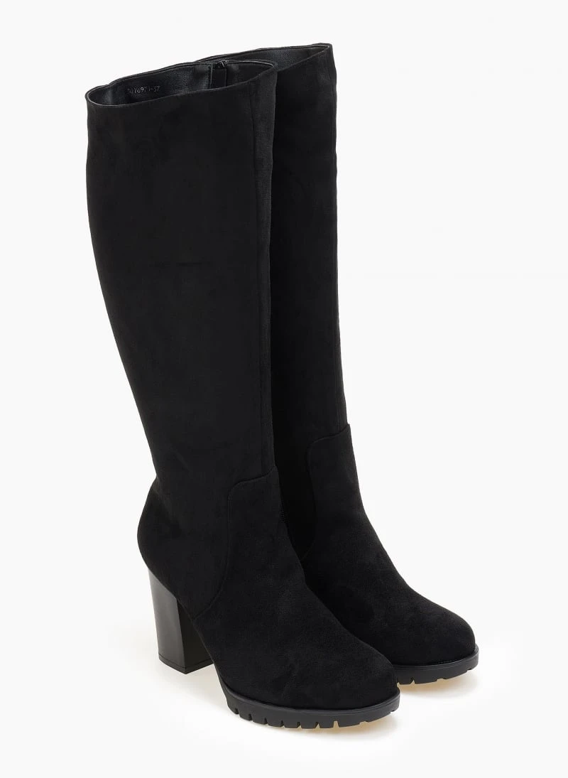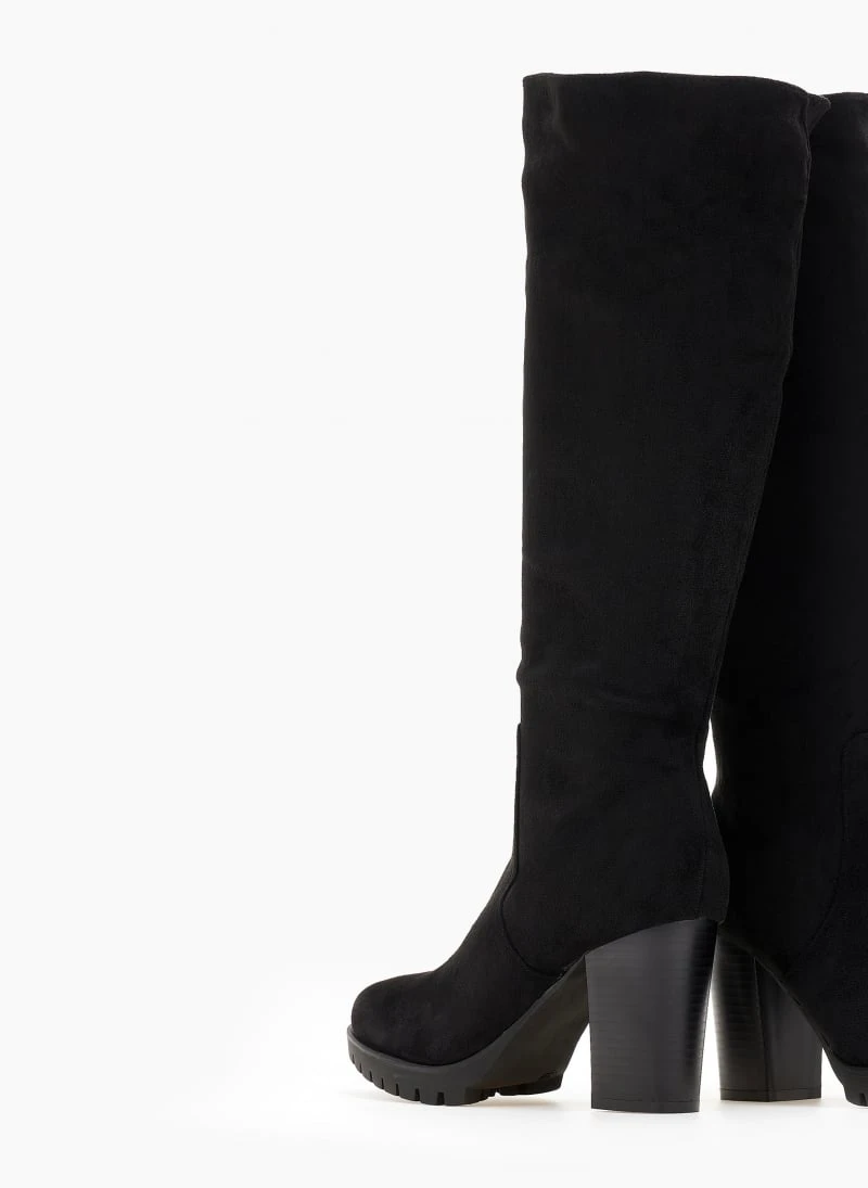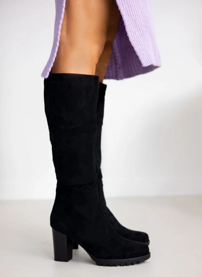 Μπότες από ελαστικό suede με τακούνι. Έχουν τρακτερωτή σόλα. Στρογγυλή γραμμή.