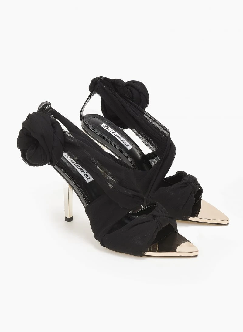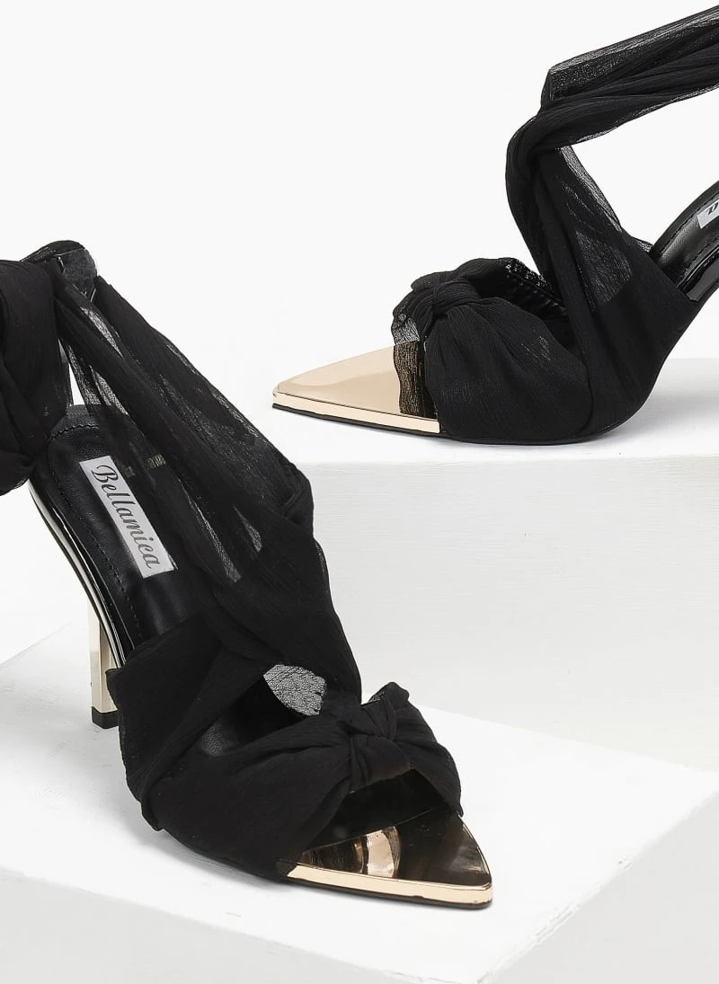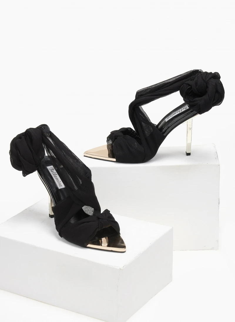 Μυτερά πέδιλα με κορδέλα. Έχει μεταλλικό τακούνι και μύτη. Τακούνι ψηλό και λεπτό. Λεπτομέρειες απο λουστρίνι. Lace up δέσιμο.