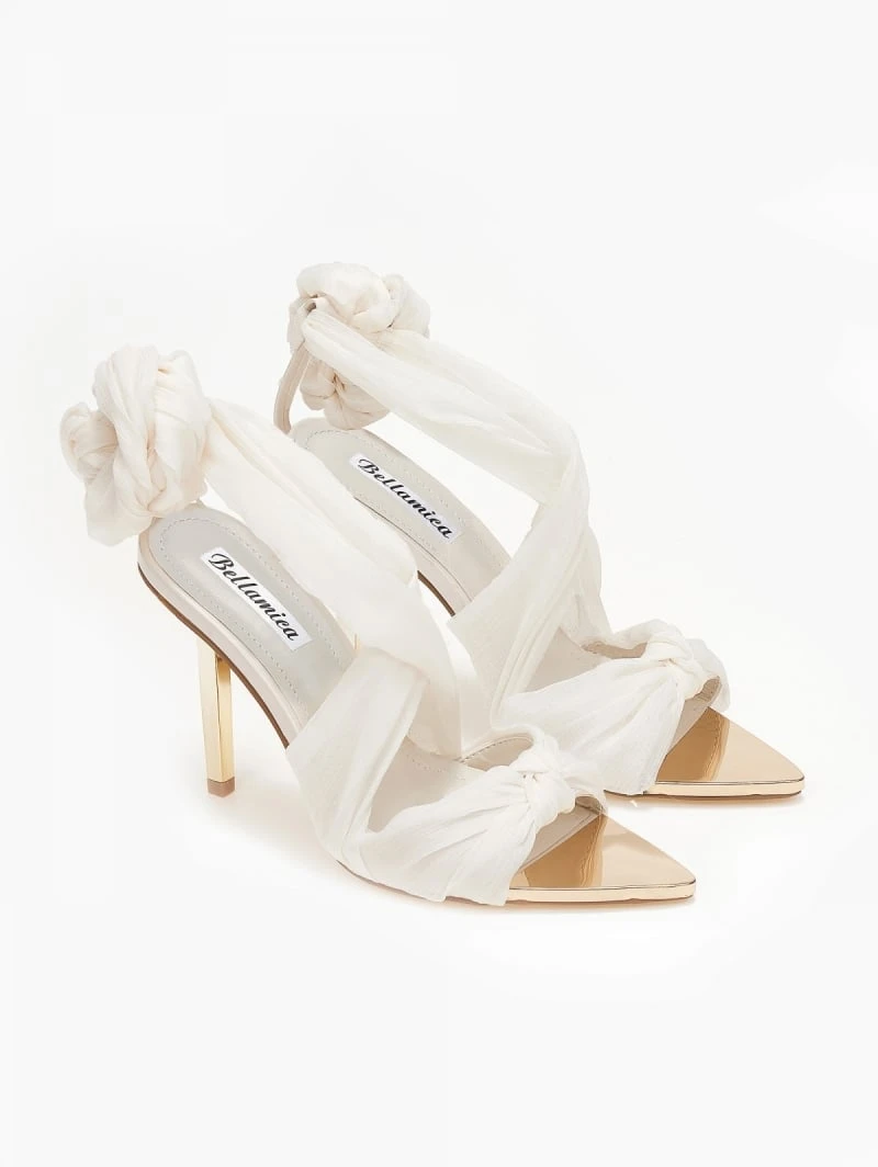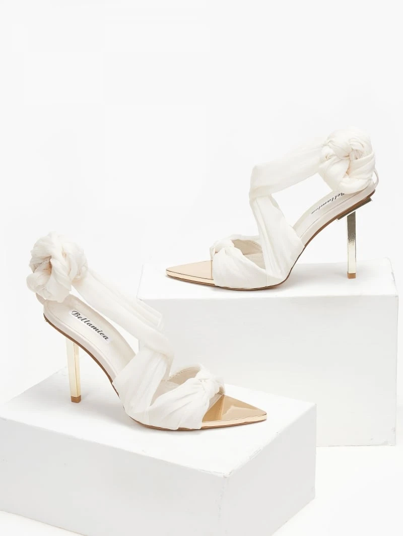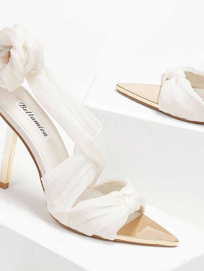 Μυτερά πέδιλα με κορδέλα. Έχει μεταλλικό τακούνι και μύτη. Τακούνι ψηλό και λεπτό. Λεπτομέρειες απο λουστρίνι. Lace up δέσιμο.