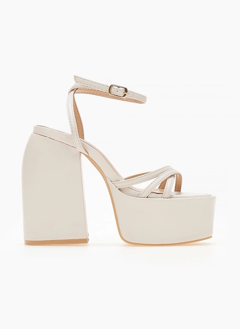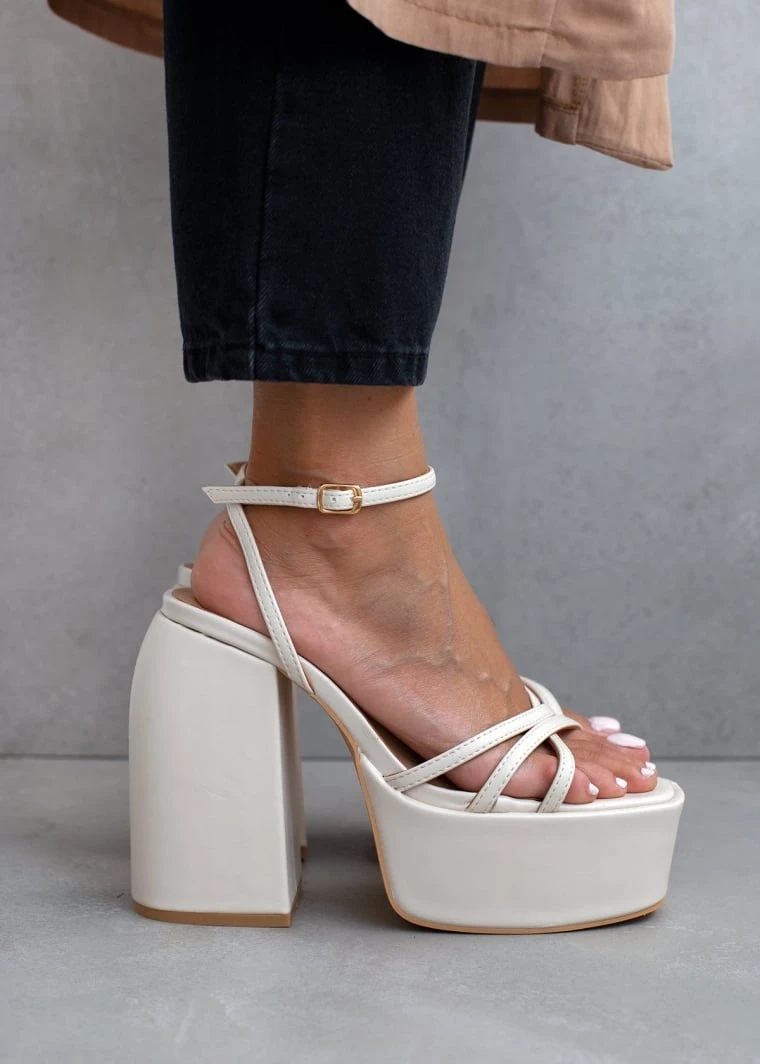Πέδιλα platform με μπαρέτα και λουράκια χιαστί. Έχουν ψηλή φιάπα. Χοντρό τακούνι με ιδιαίτερο σχήμα.