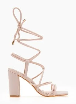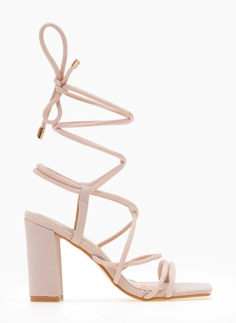 Πέδιλα με lace up δέσιμο στη γάμπα. Έχουν ψηλό χοντρό τακούνι. Καρέ γραμμή.