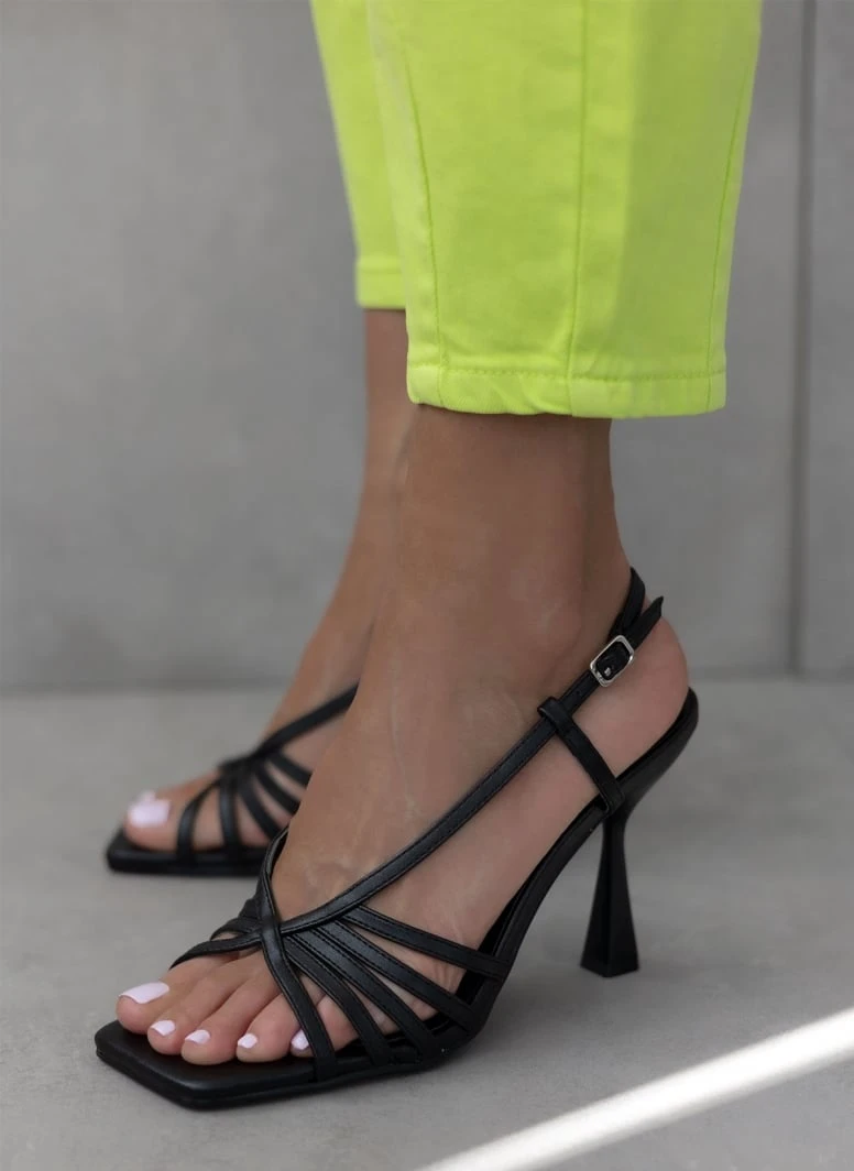 Πέδιλα σε καρέ γραμμή. Έχουν ιδιαίτερο τακούνι. Λεπτά λουράκια και δένει στο ύψος του αστραγάλου.