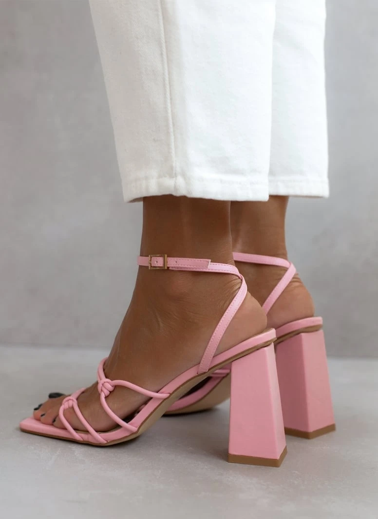 Πέδιλα με λεπτά λουράκια και σχέδιο κόμπους στο πλάι. Δένουν με μπαρέτα στο ύψος του αστραγάλου. Έχουν ιδιαίτερο χοντρό τακούνι. Καρέ γραμμή.