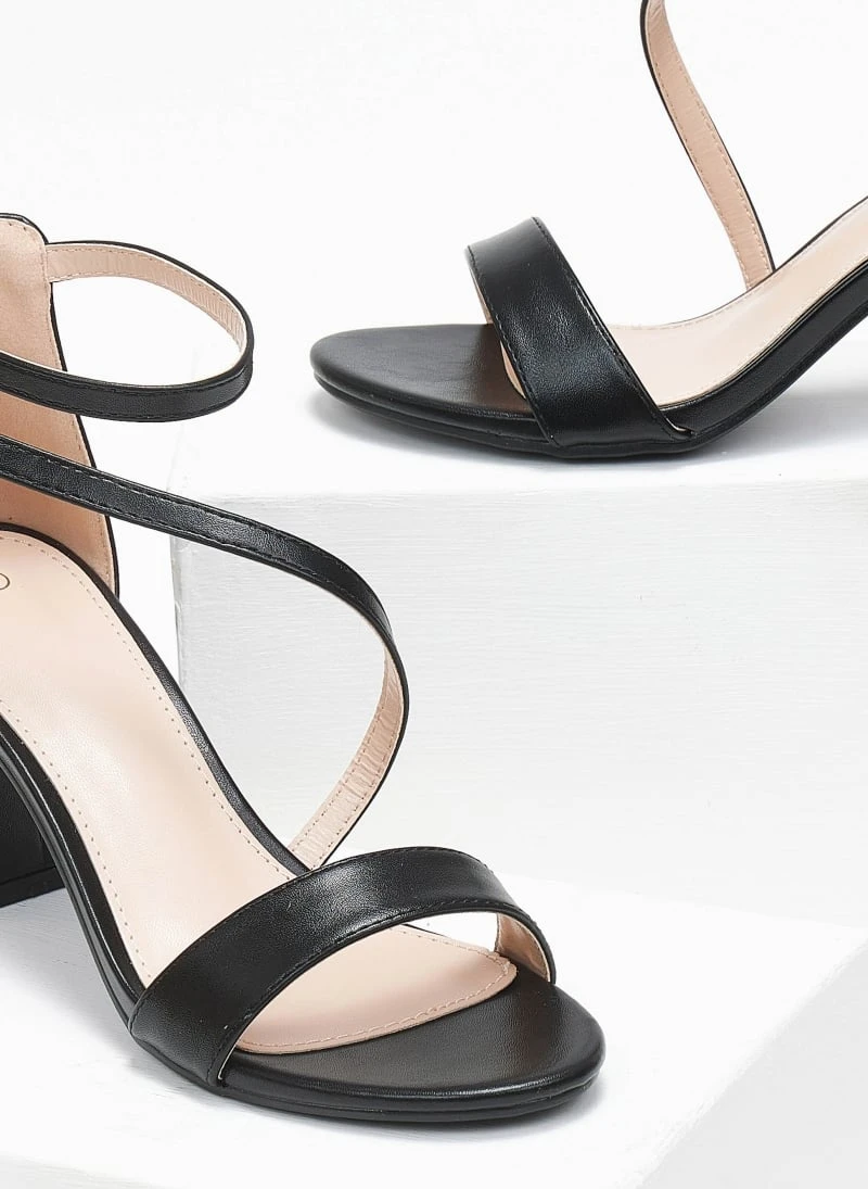 Πέδιλα με χαμηλό τετράγωνο τακούνι. Δένουν με μπαρέτα στο ύψος του αστραγάλου. Έχουν λοξό λουράκι. Στρογγυλή γραμμή.