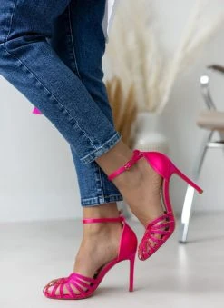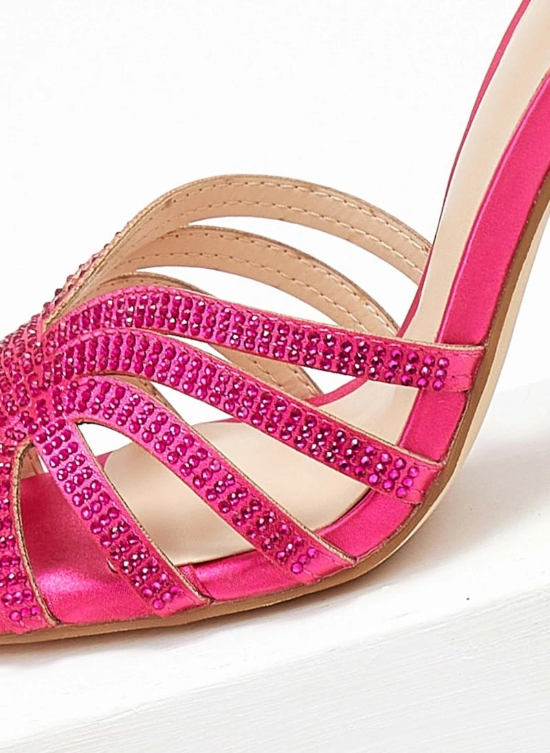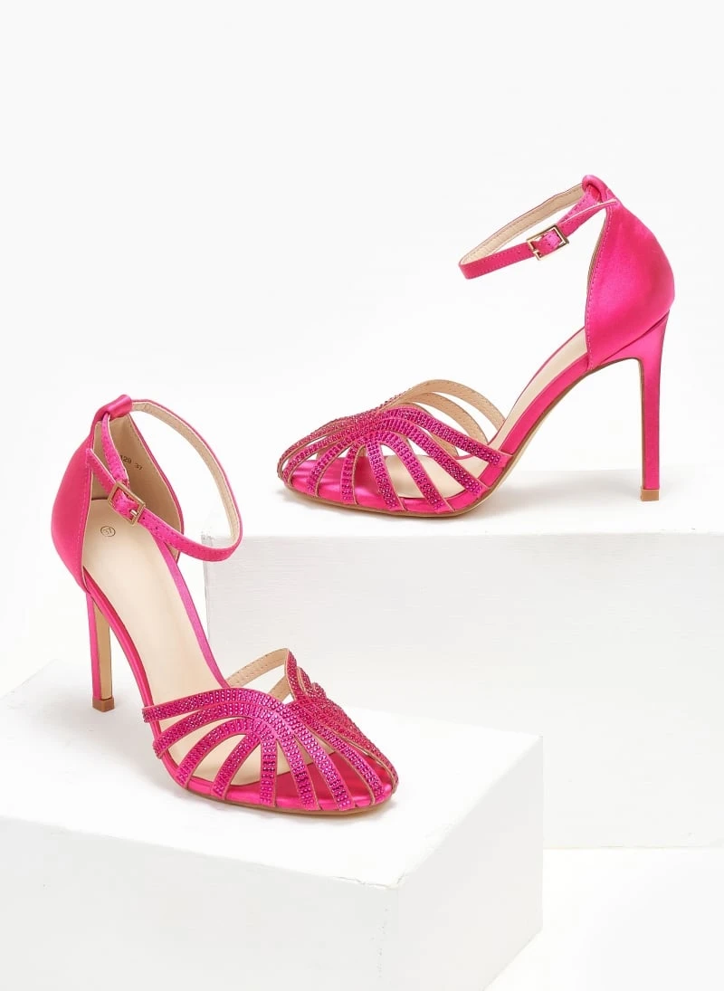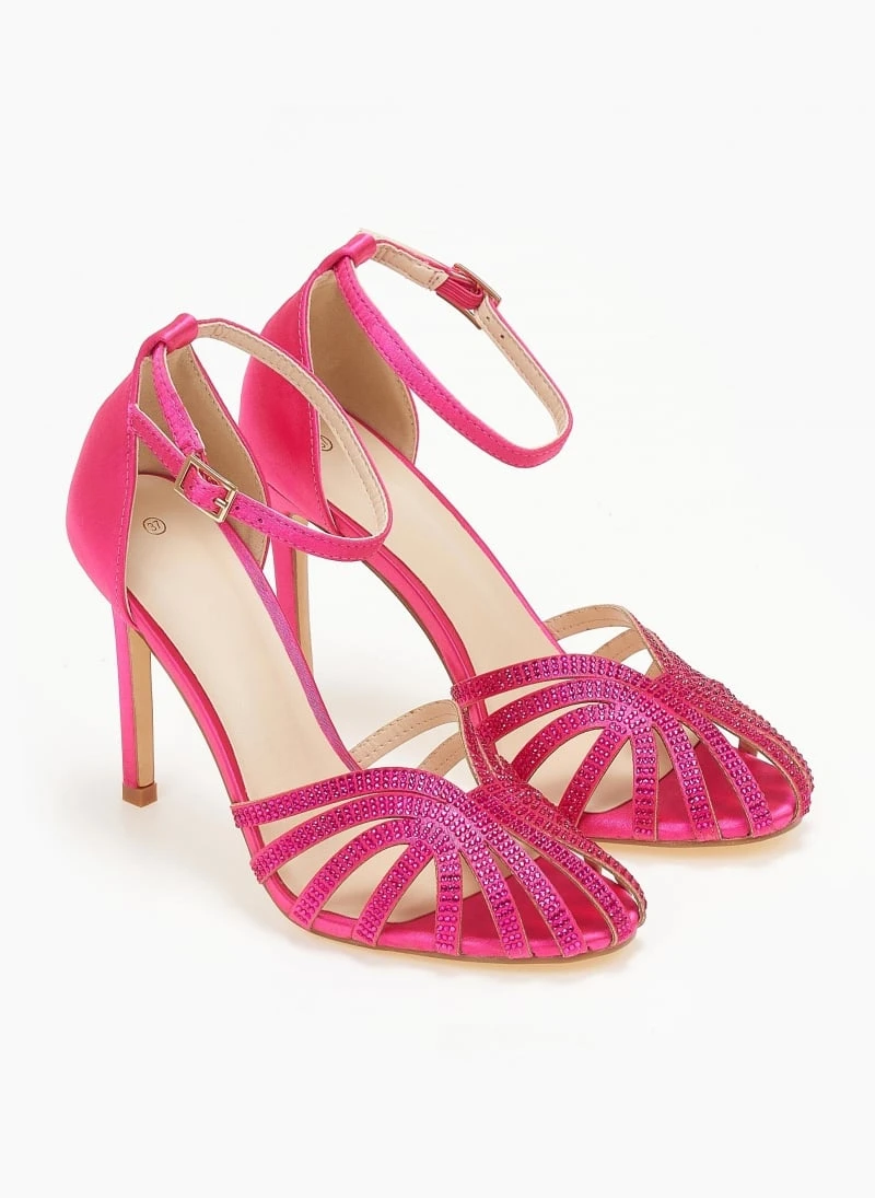 Πέδιλα σατέν σε ρετρό σχέδιο με strass. Έχουν κλειστή φτέρνα. Δένουν με μπαρέτα στο ύψος του αστραγάλοτ. Ψηλό λεπτό τακούνι.