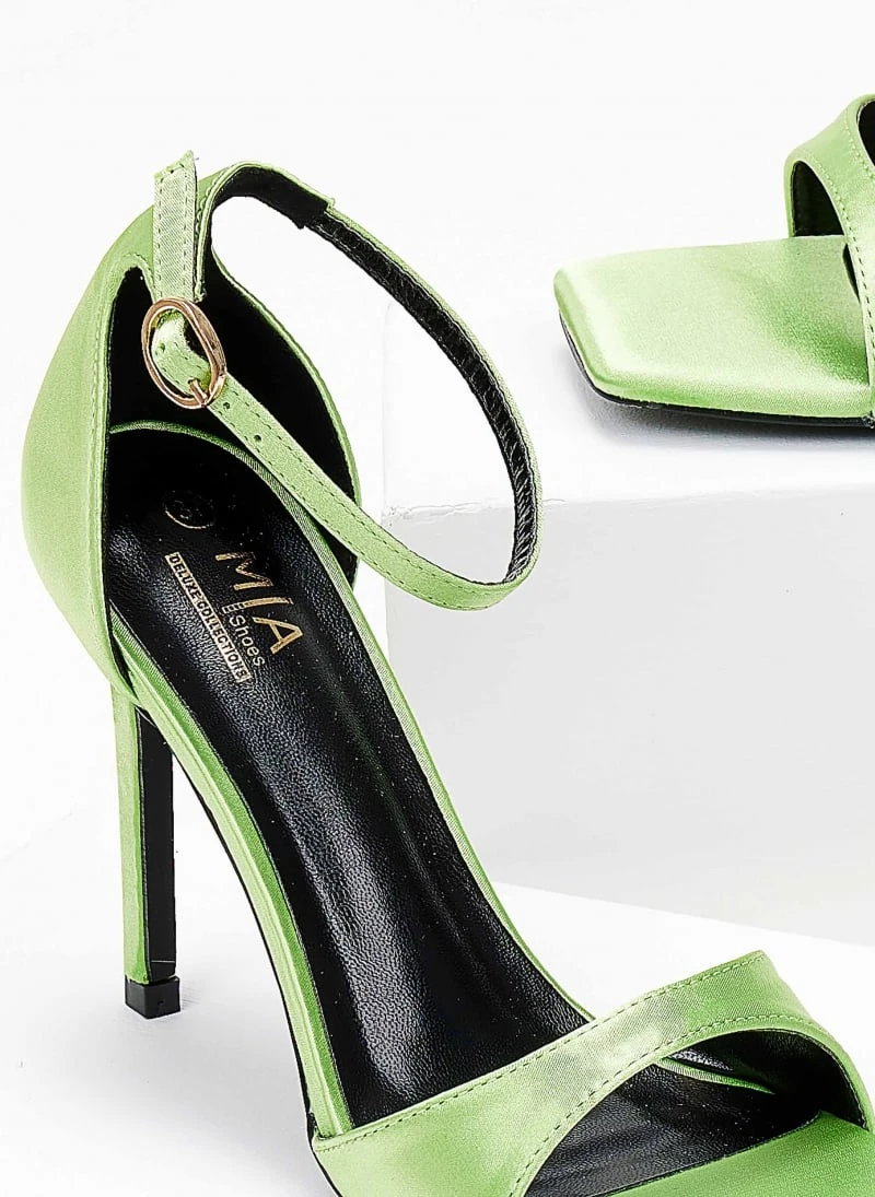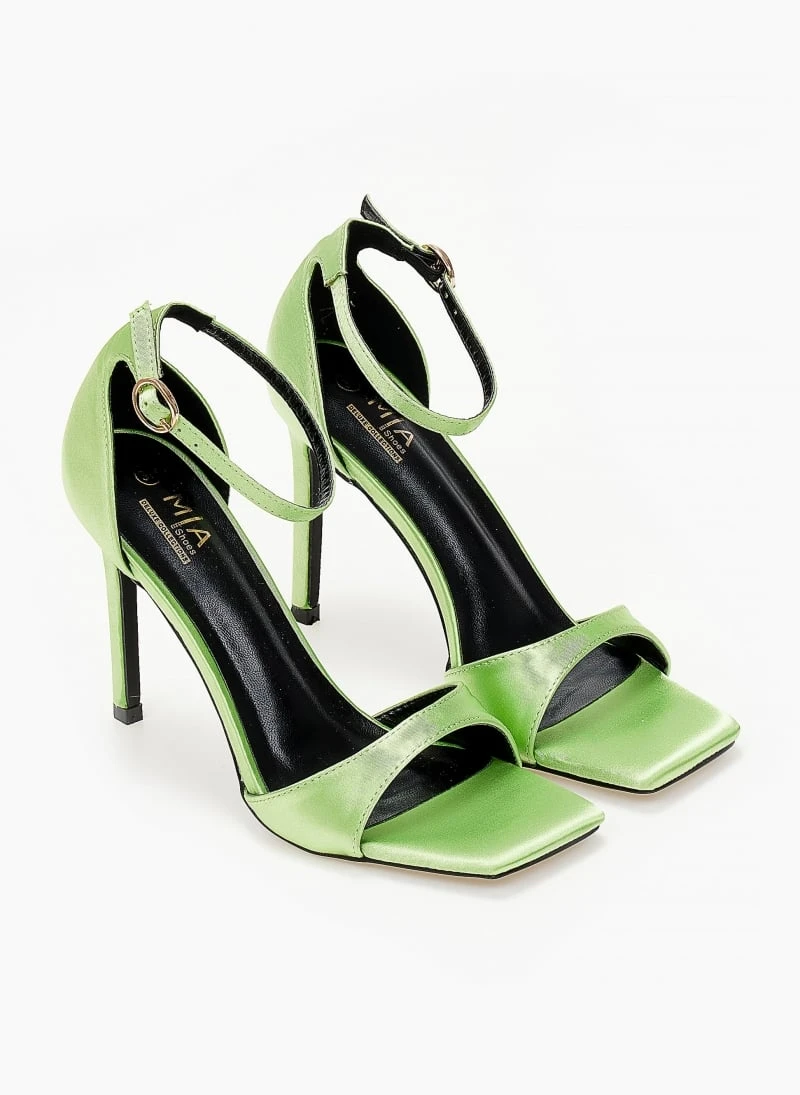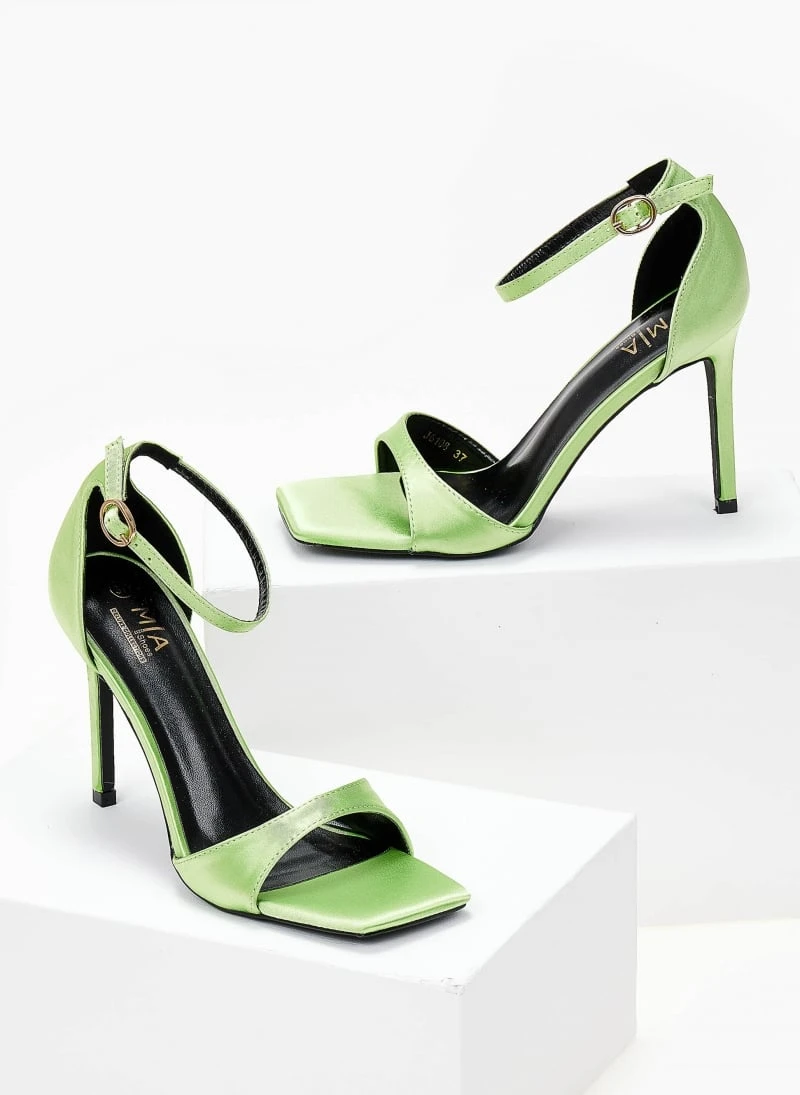 Πέδιλα σατέν με ψηλό λεπτό τακούνι. Έοχυν κλειστή φτέρνα. Δένουν με μπαρέτα στο ύψος του αστραγάλου. Καρέ γραμμή.