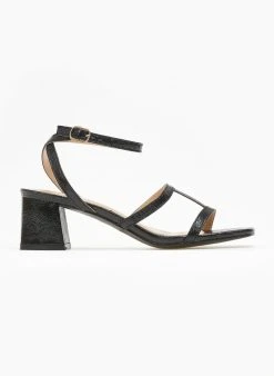 Πέδιλα με λεπτά λουράκια. Δένουν με μπαρέτα στο ύψος του αστραγάλου. Τετράγωνο χαμηλό τακούνι. Καρέ γραμμή.