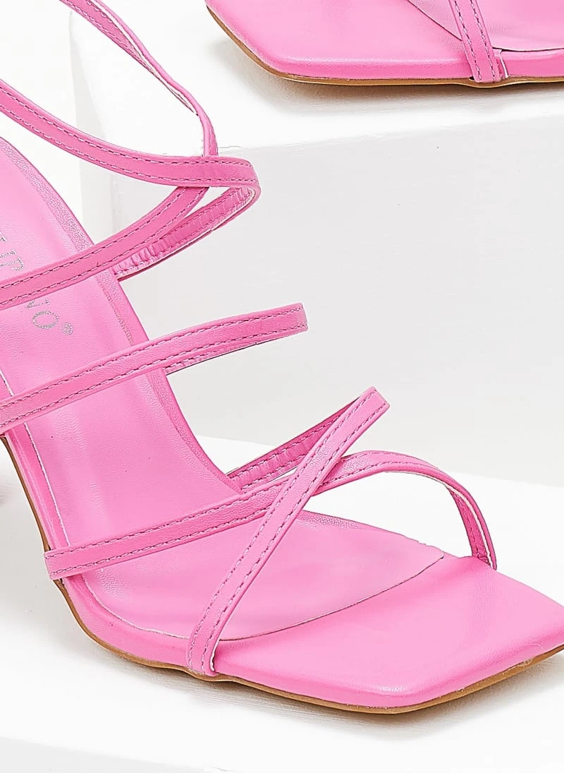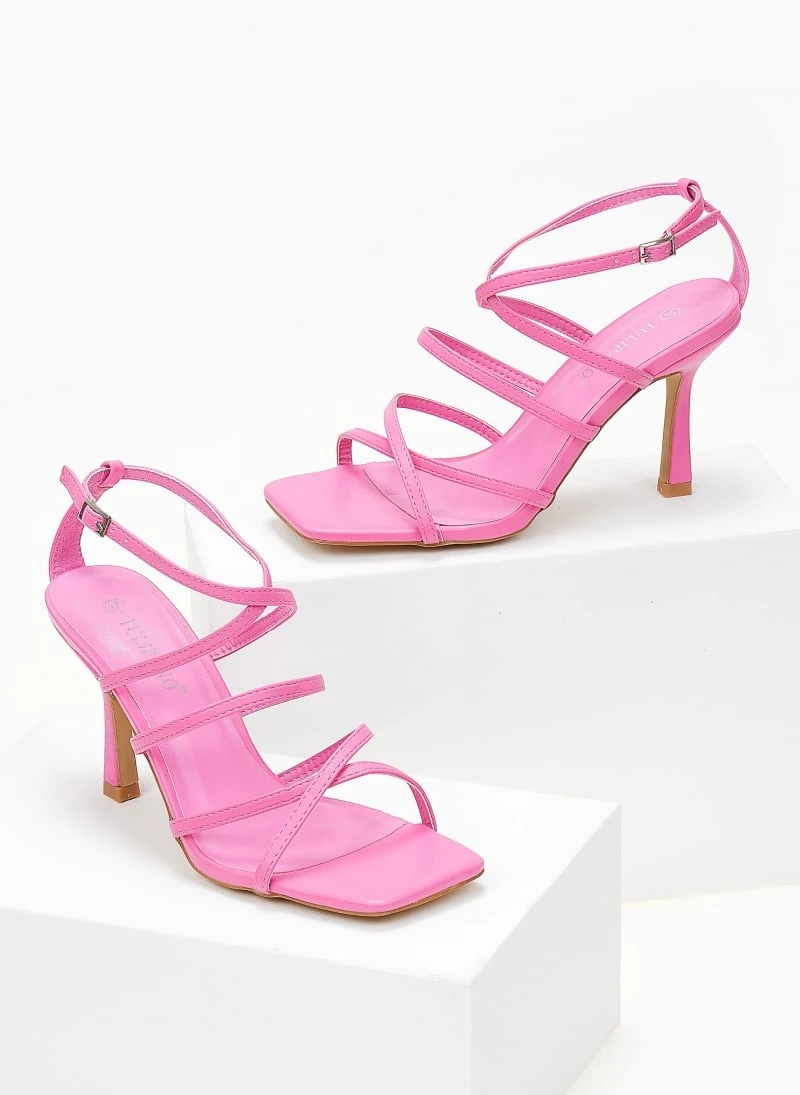 Πέδιλα με λεπτά λουράκια. Έχουν χιαστί δέσιμο στο ύψος του κουτεπιέ. Ψηλό λεπτό τακούνι. Καρέ γραμμή.