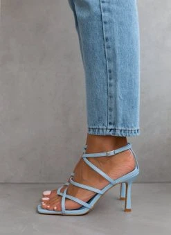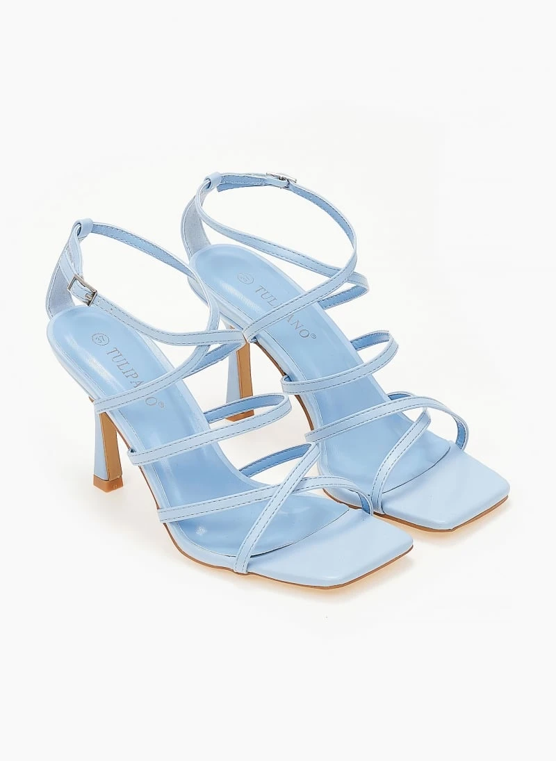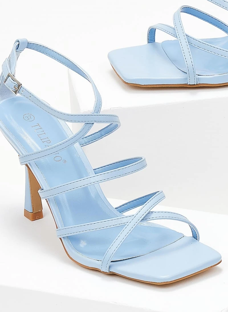 Πέδιλα με λεπτά λουράκια. Έχουν χιαστί δέσιμο στο ύψος του κουτεπιέ. Ψηλό λεπτό τακούνι. Καρέ γραμμή.