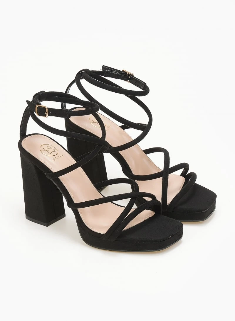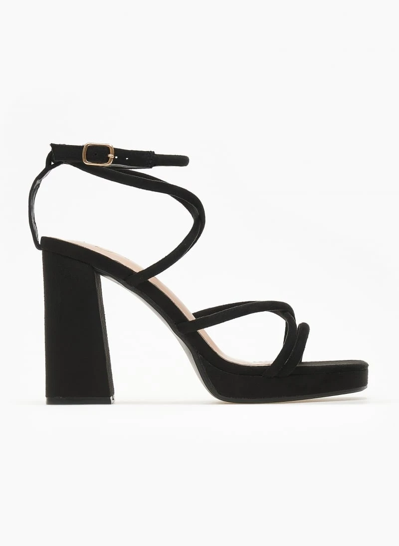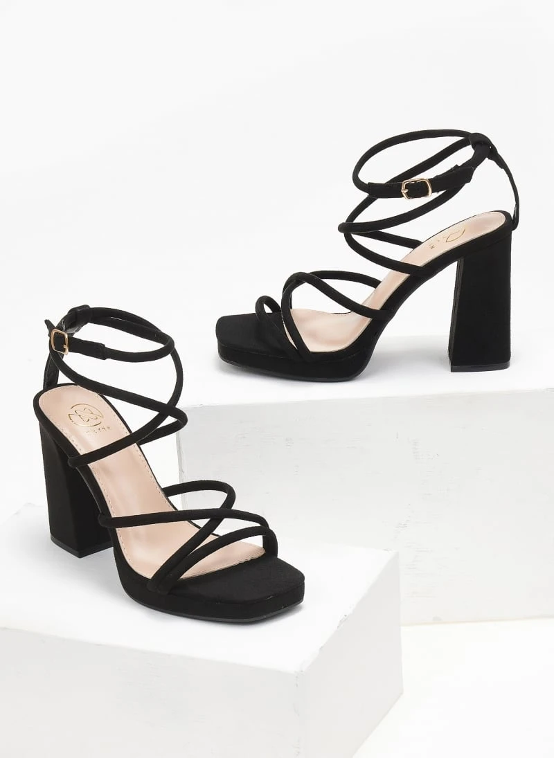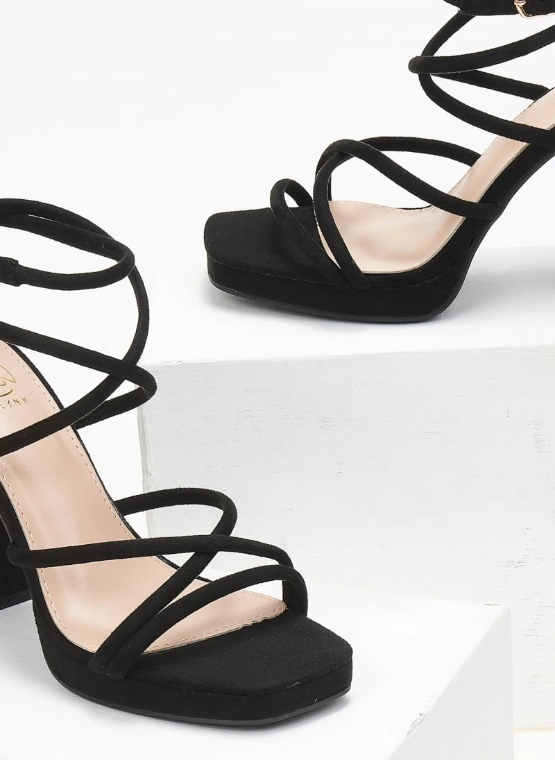 Πέδιλα suede με στρογγυλά λουράκια. Έχουν φιάπα και ψηλό χοντρό τακούνι. Χιαστί σχέδιο στο κουτεπιέ και δέσιμο με μπαρέτα στο ύψος του αστραγάλου. Καρέ γραμμή.