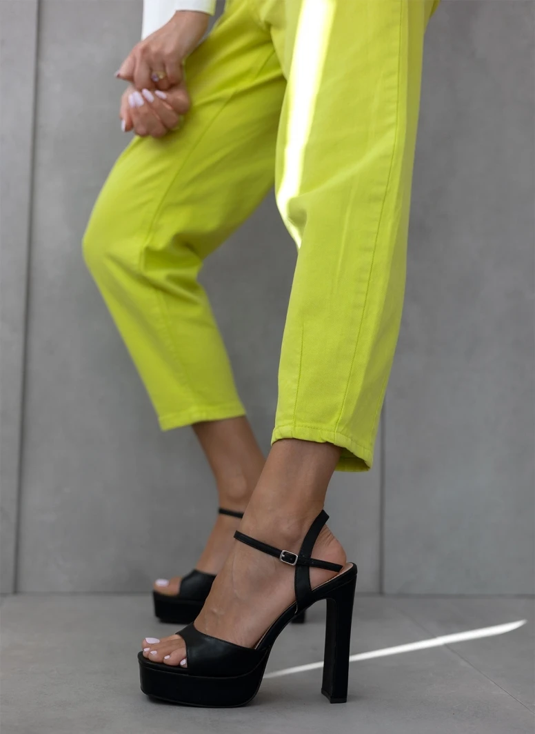 Πέδιλα με φιάπα και ψηλό τακούνι. Δένουν με μπαρέτα στο ύψος του αστραγάλου. Καρέ γραμμή.