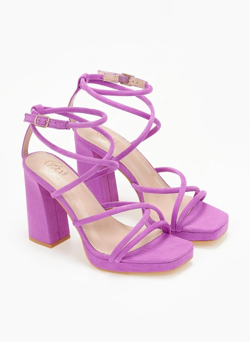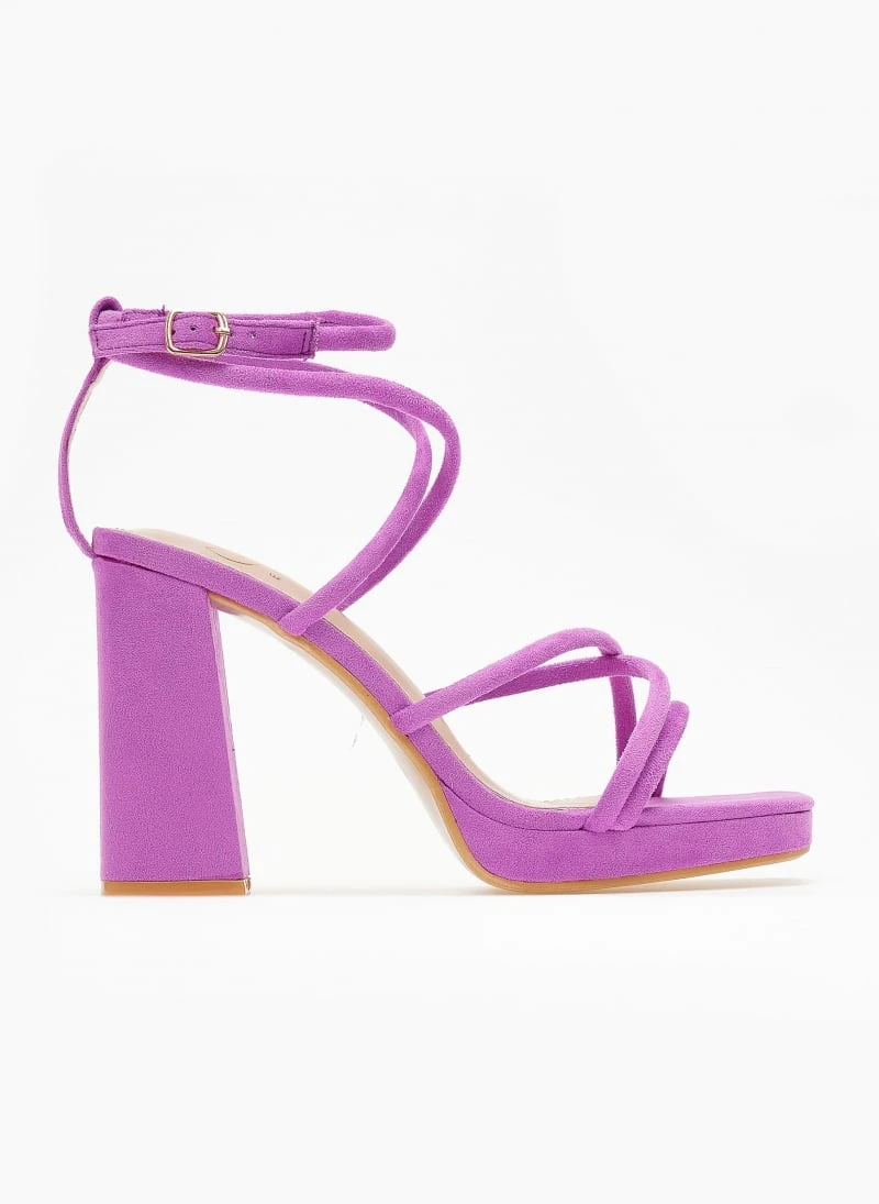 Πέδιλα suede με στρογγυλά λουράκια. Έχουν φιάπα και ψηλό χοντρό τακούνι. Χιαστί σχέδιο στο κουτεπιέ και δέσιμο με μπαρέτα στο ύψος του αστραγάλου. Καρέ γραμμή.