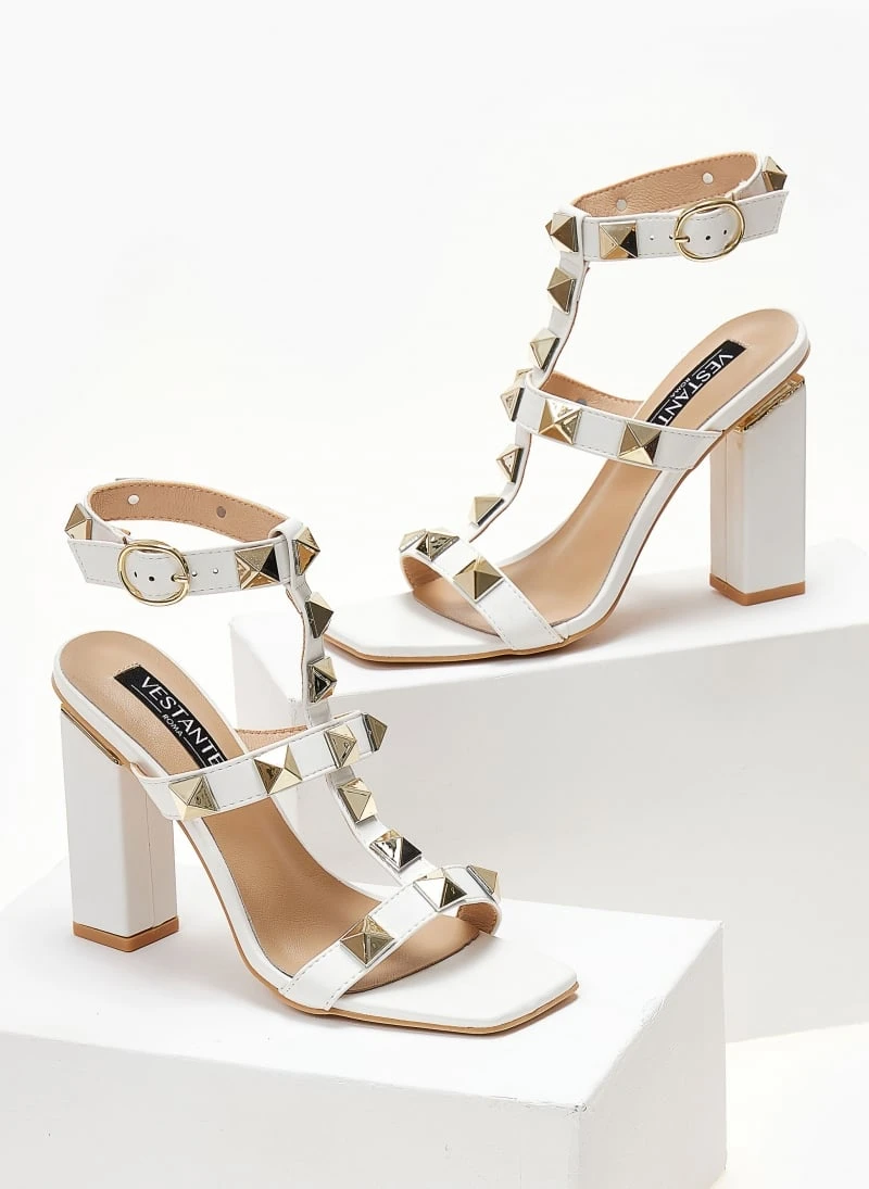 Πέδιλα με ψηλό χοντρό τακούνι. Έχουν διακοσμητικά μεταλλικά τρουκς. Δένουν με μπαρέτα στο ύψος του αστραγάλου. Καρέ γραμμή.