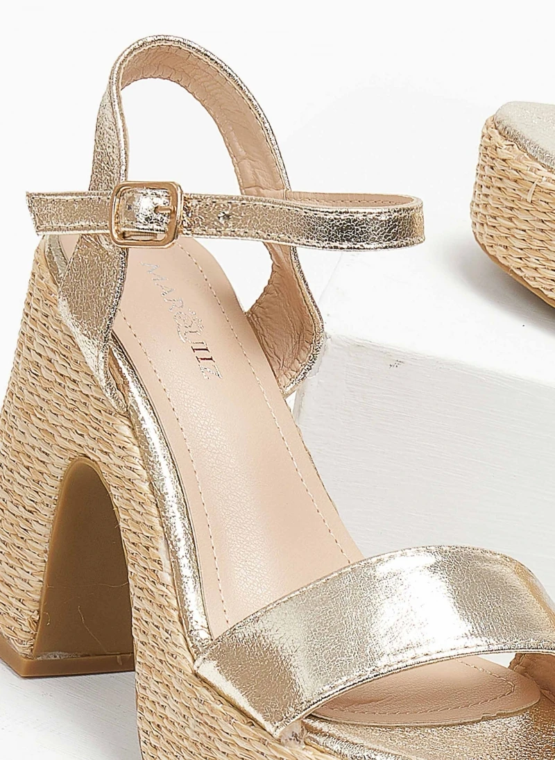 Πέδιλα με ψηλό χοντρό τακούνι και φιάπα από ψάθα. Δένουν με μπαρέτα στο ύψος του αστραγάλου. Σόλα με λάστιχο.
