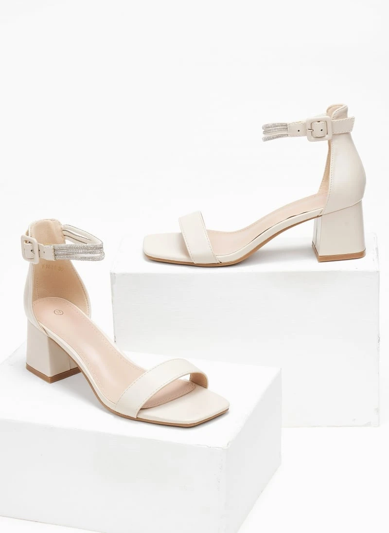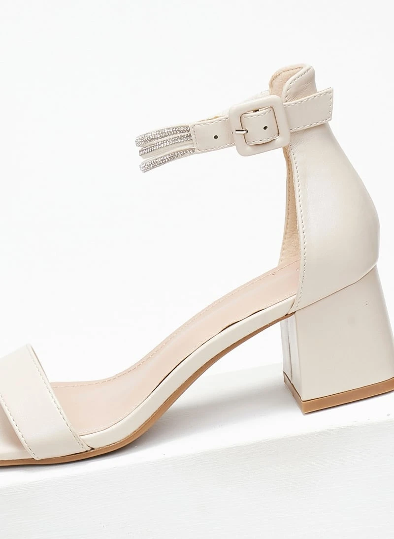 Πέδιλα με χαμηλό τετράγωνο τακούνι. Δένουν με μπαρέτα στο ύψος του αστραγάλου. Λεπτομέρειες με strass στο δέσιμο. Καρέ γραμμή.