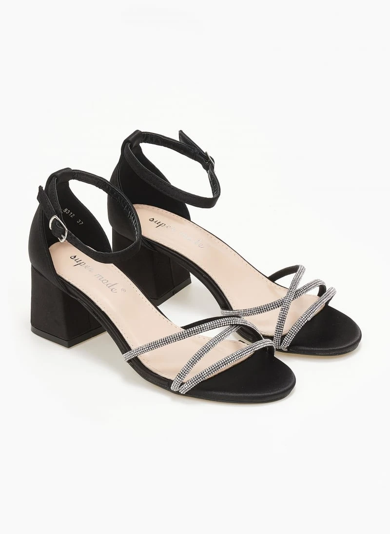 Πέδιλα σατέν με strass λουράκια. Δένουν με μπαρέτα στο ύψος του αστραγάλου. Στρογγυλή γραμμή. Κλειστή φτέρνα.