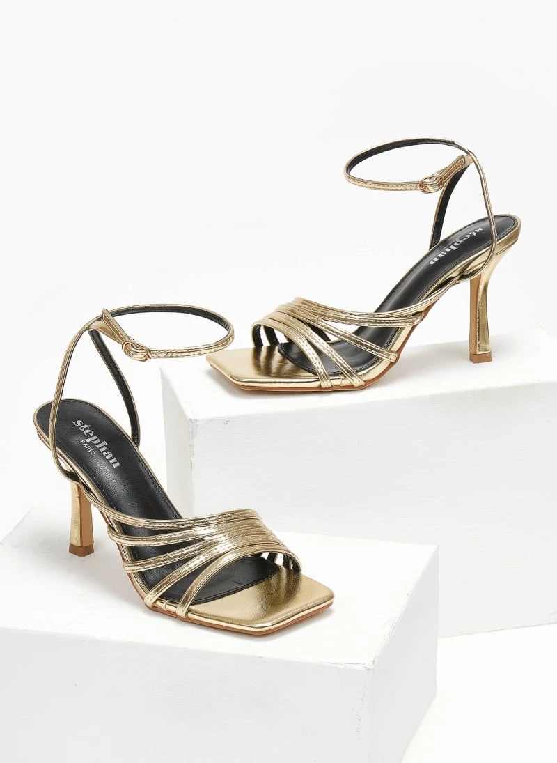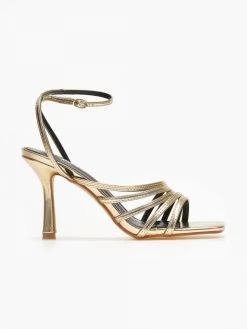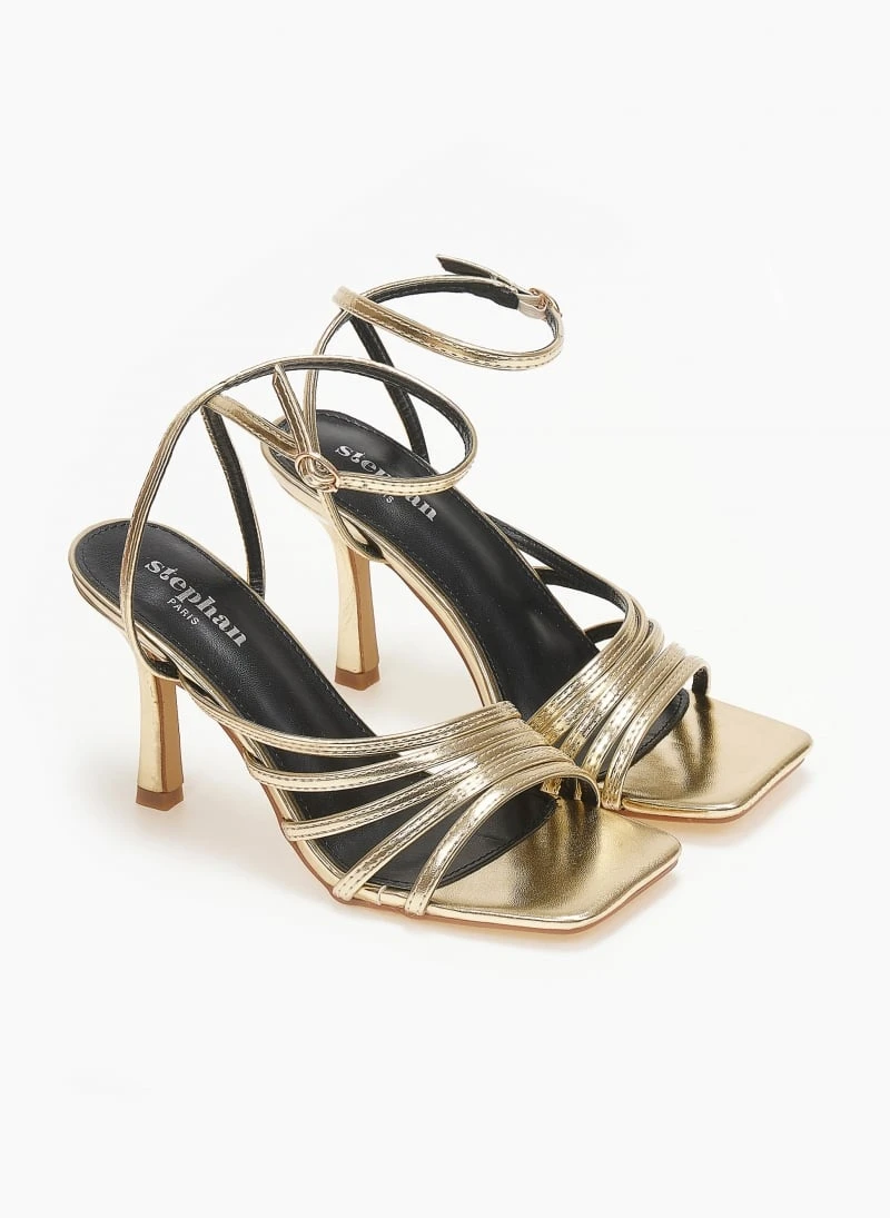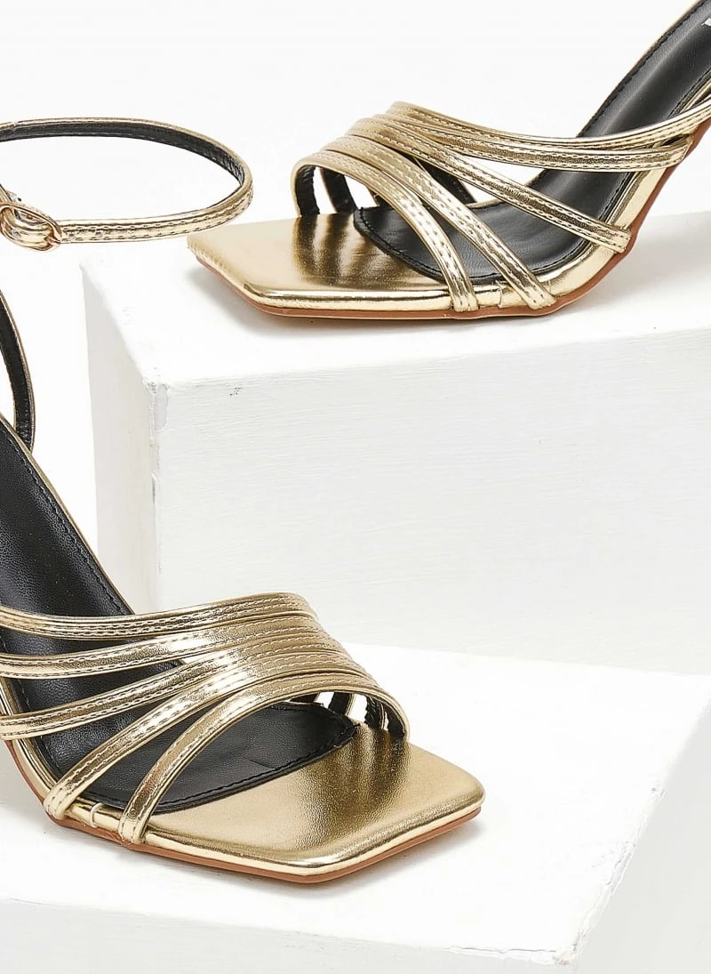 Πέδιλα με λεπτά λουράκια σε μεταλλικά χρώματα. Δένουν με μπαρέτα στο ύψος του αστραγάλου. Καρέ γραμμή.