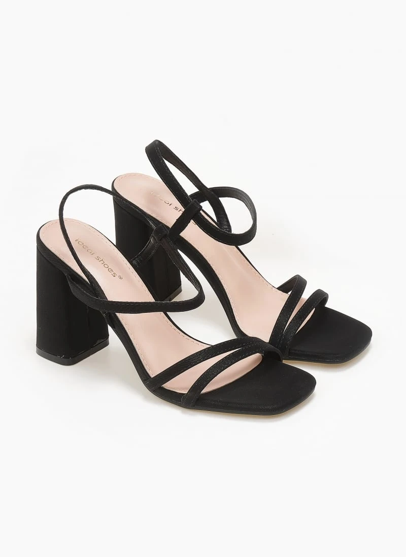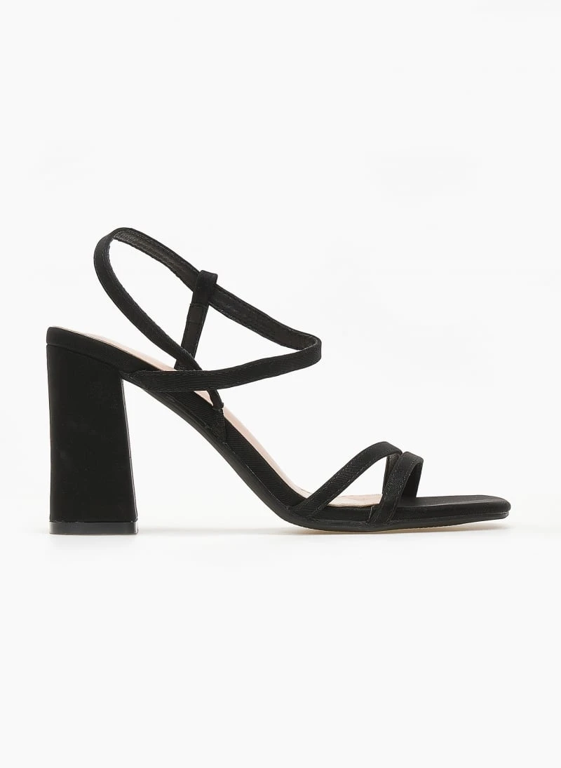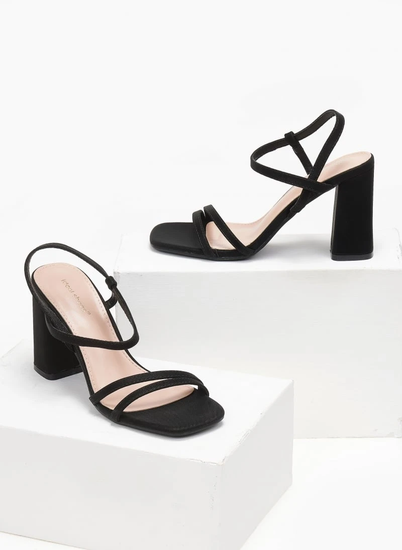 Πέδιλα σε καρέ γραμμή. Έχουν περαστό λουράκι στο ύψος του κουτεπιέ. Διακριτικό λάστιχο στο πλάι για καλύτερη εφαρμογή. Ψηλό χοντρό τακούνι.