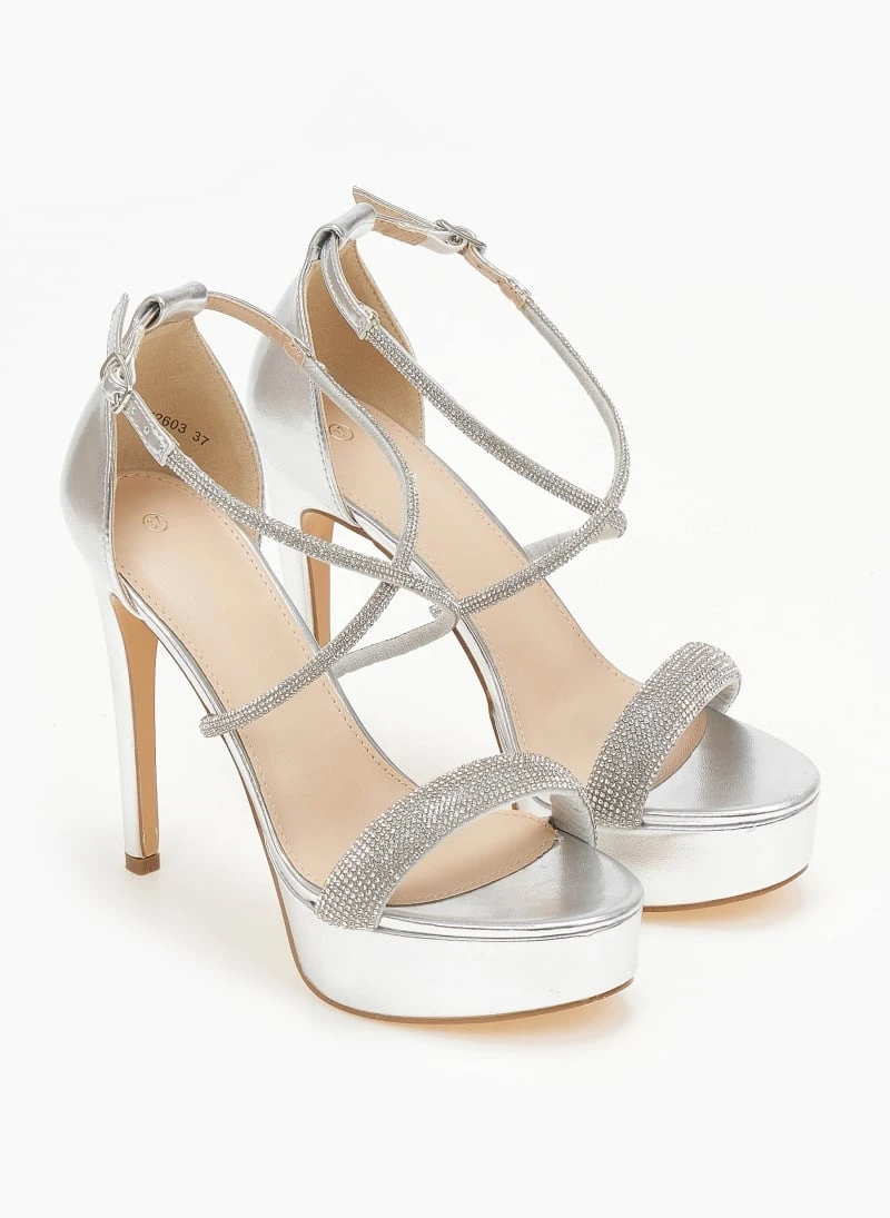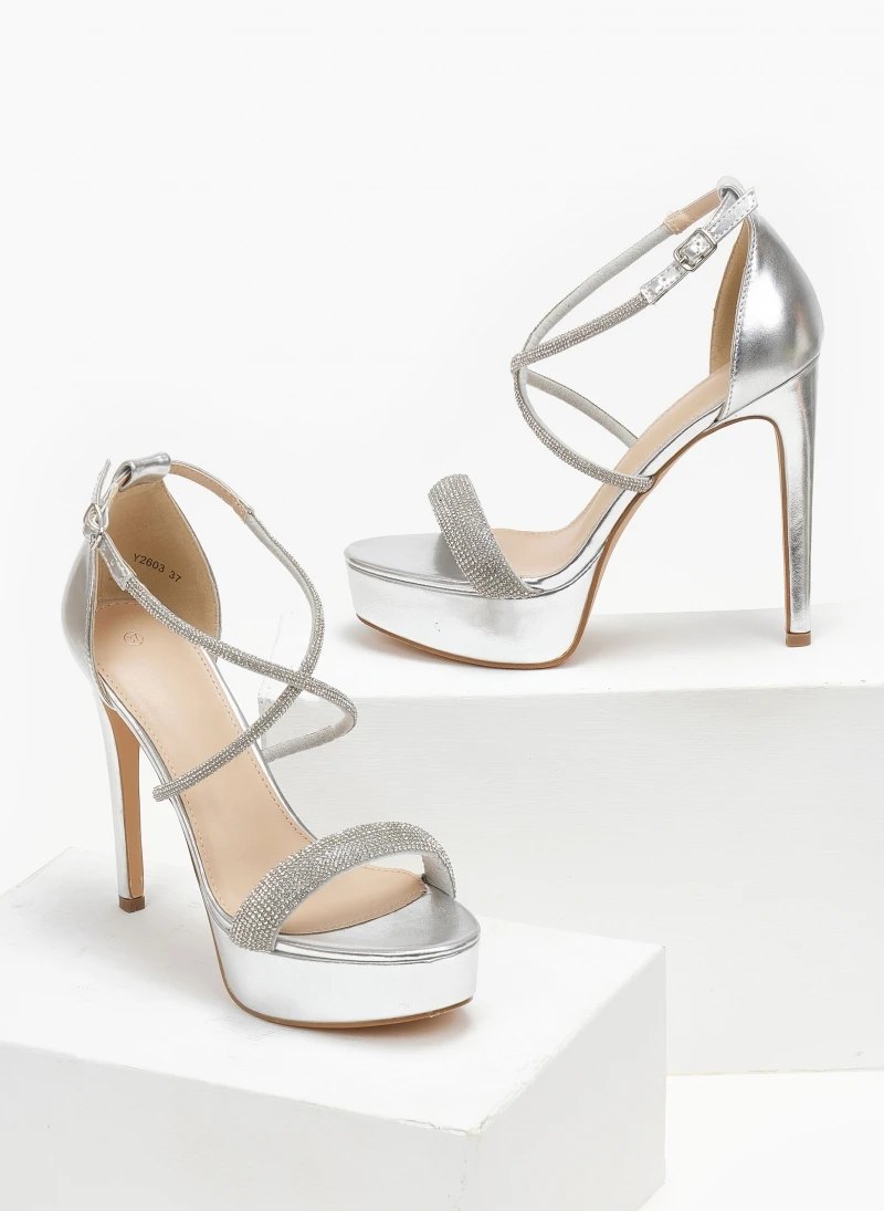 Πέδιλα με strass λουράκια. Έχουν φιάπα και ψηλό τακούνι. Δένουν με χιαστί λουράκια στο ύψος του αστραγάλου. Έχουν κλειστή φτέρνα. Μαλακός πάτος.