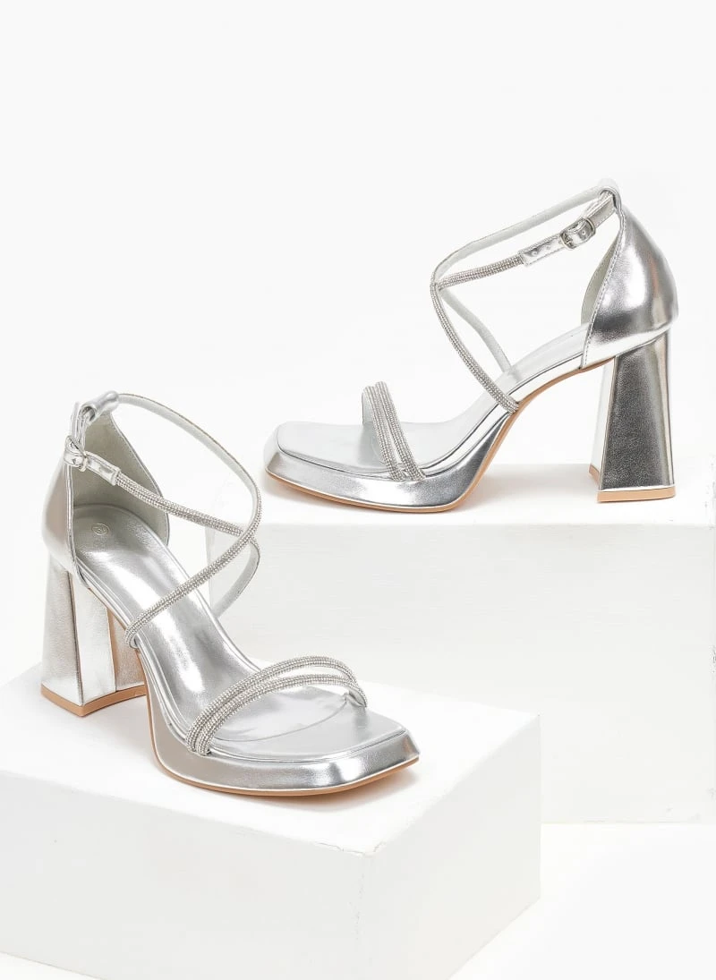 Πέδιλα με strass λουράκια. Έχουν ψηλό τακούνι καμπάνα και φιάπα. Καρέ γραμμή. Δένουν στο πλάι. Κλειστή φτέρνα.