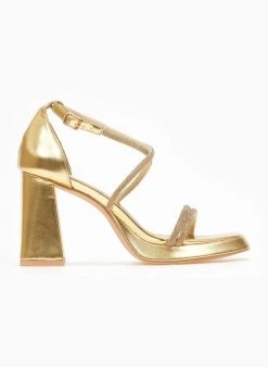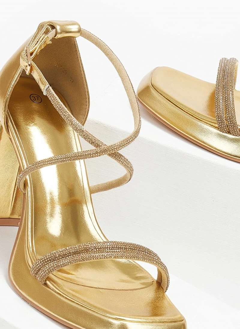 Πέδιλα με strass λουράκια. Έχουν ψηλό τακούνι καμπάνα και φιάπα. Καρέ γραμμή. Δένουν στο πλάι. Κλειστή φτέρνα.