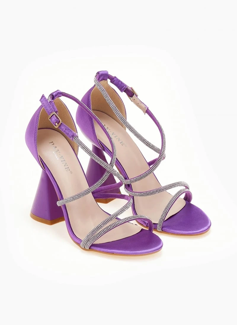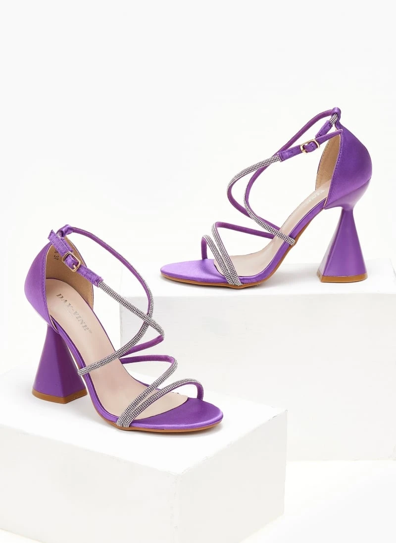Πέδιλα σατέν με strass. Έχουν ψηλό τακούνι καμπάνα. Η φτέρνα είναι κλειστή. Δένουν με χιαστί strass λουράκια στο κουτεπιέ.