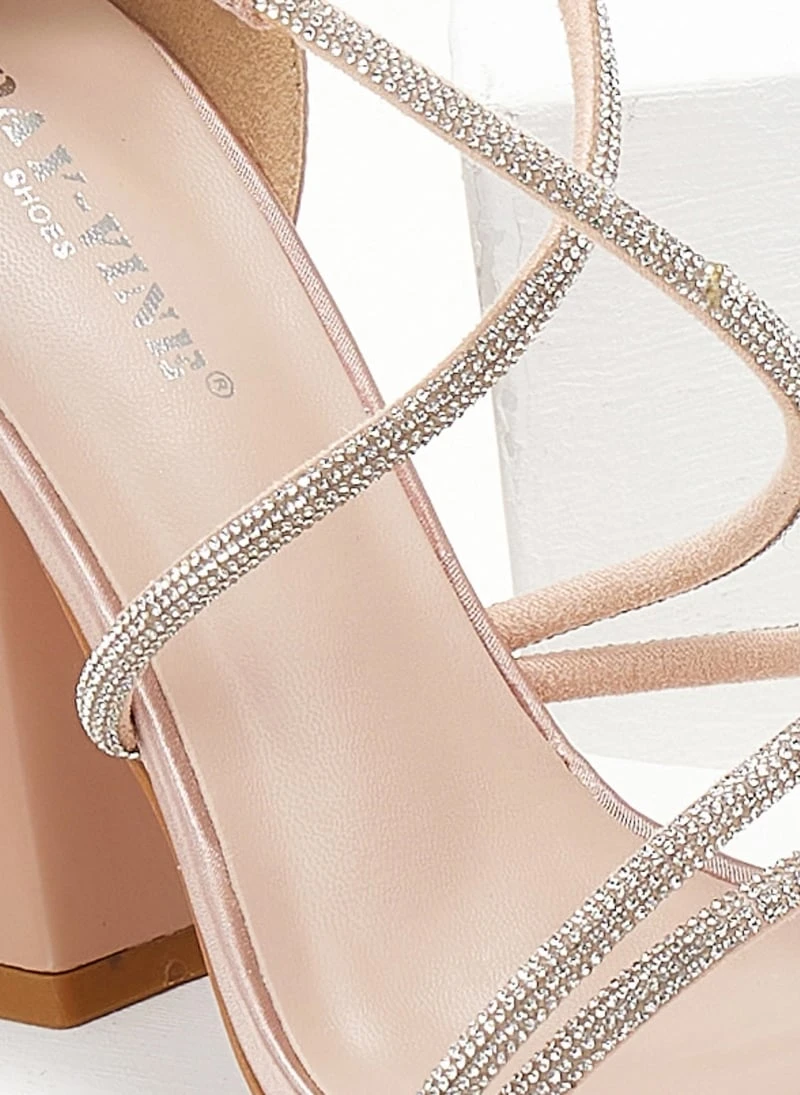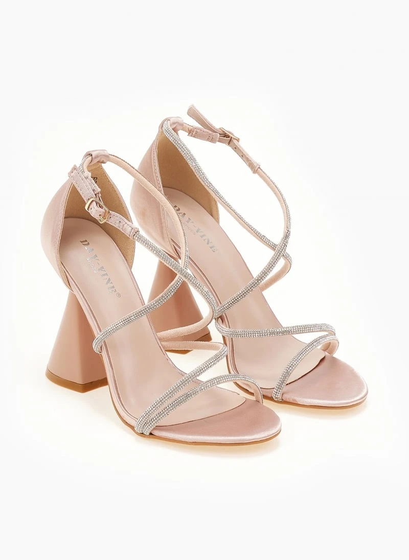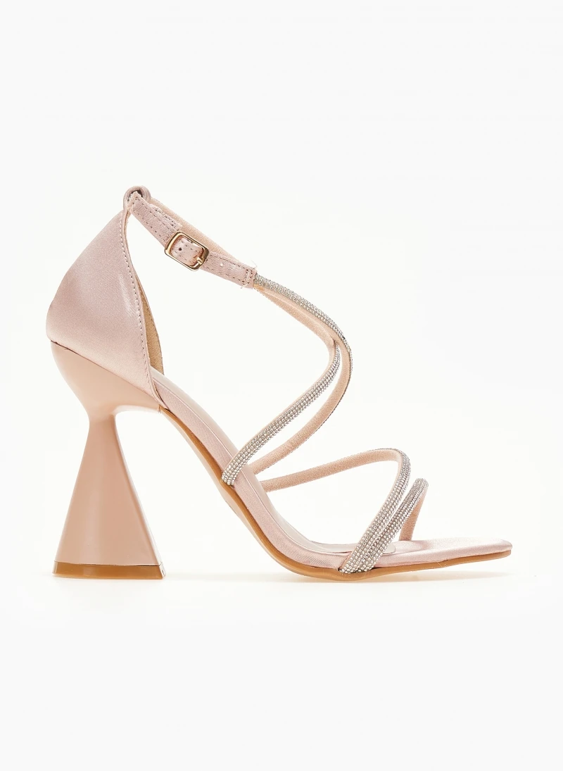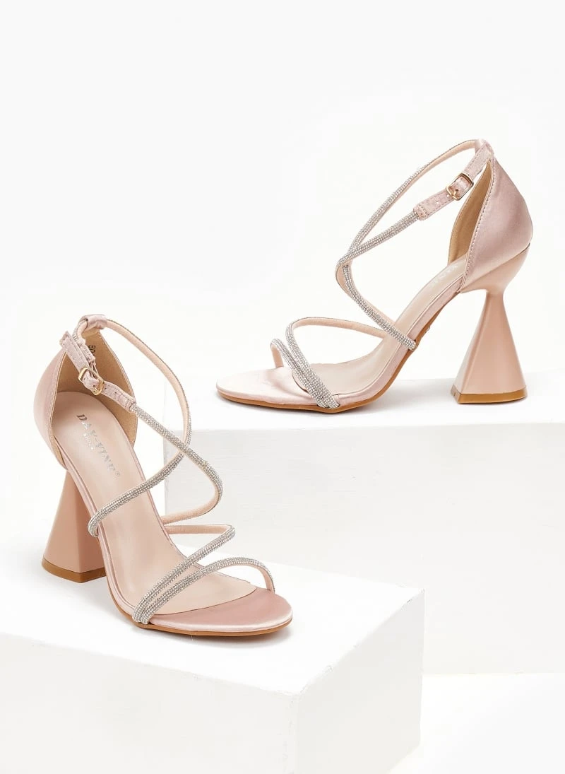 Πέδιλα σατέν με strass. Έχουν ψηλό τακούνι καμπάνα. Η φτέρνα είναι κλειστή. Δένουν με χιαστί strass λουράκια στο κουτεπιέ.