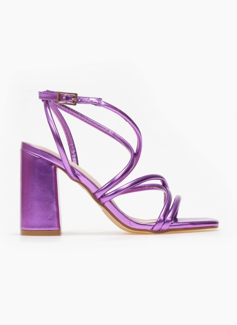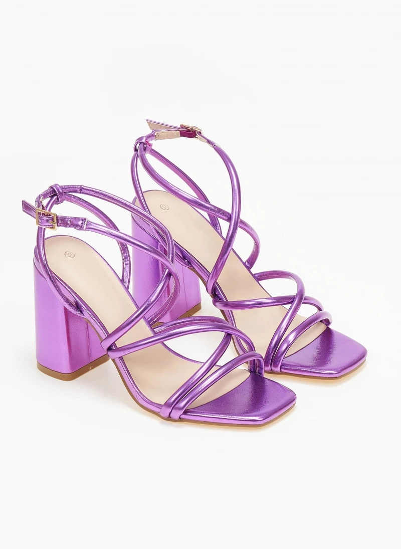 Πέδιλα σε μεταλλικά χρώματα. Έχουν ψηλό χοντρό τακούνι. Σχέδιο με λεπτά λουράκια χιαστί. Δένουν στο πλάι. Καρέ γραμμή.