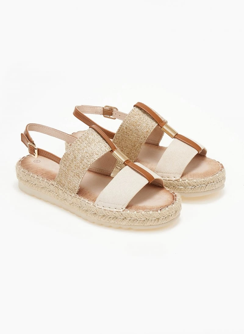 Σανδάλια με ελαφριά σχοίνινη σόλα. Συνδυάζουν suede και ψάθα. Λεπτομέρεια λουράκι δερματίνη με μεταλλικό στοιχείο. Δένουν στο πλάι. Μαλακός πάτος με ενίσχυση.