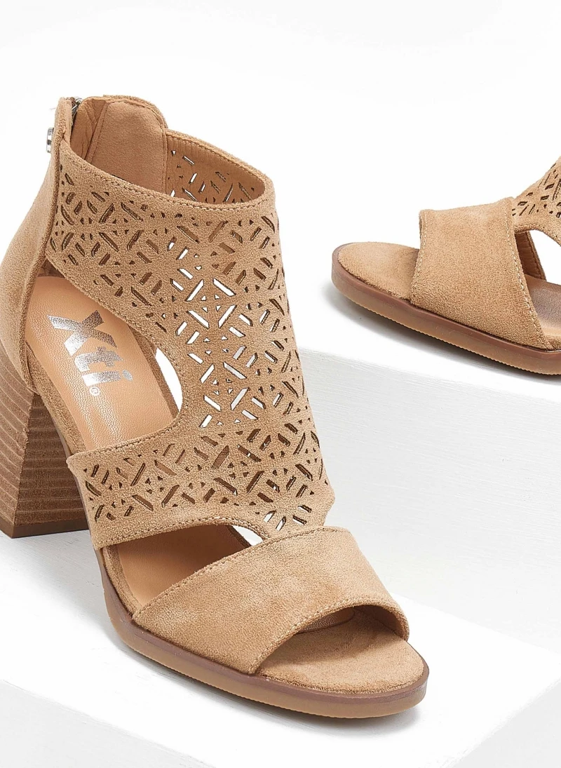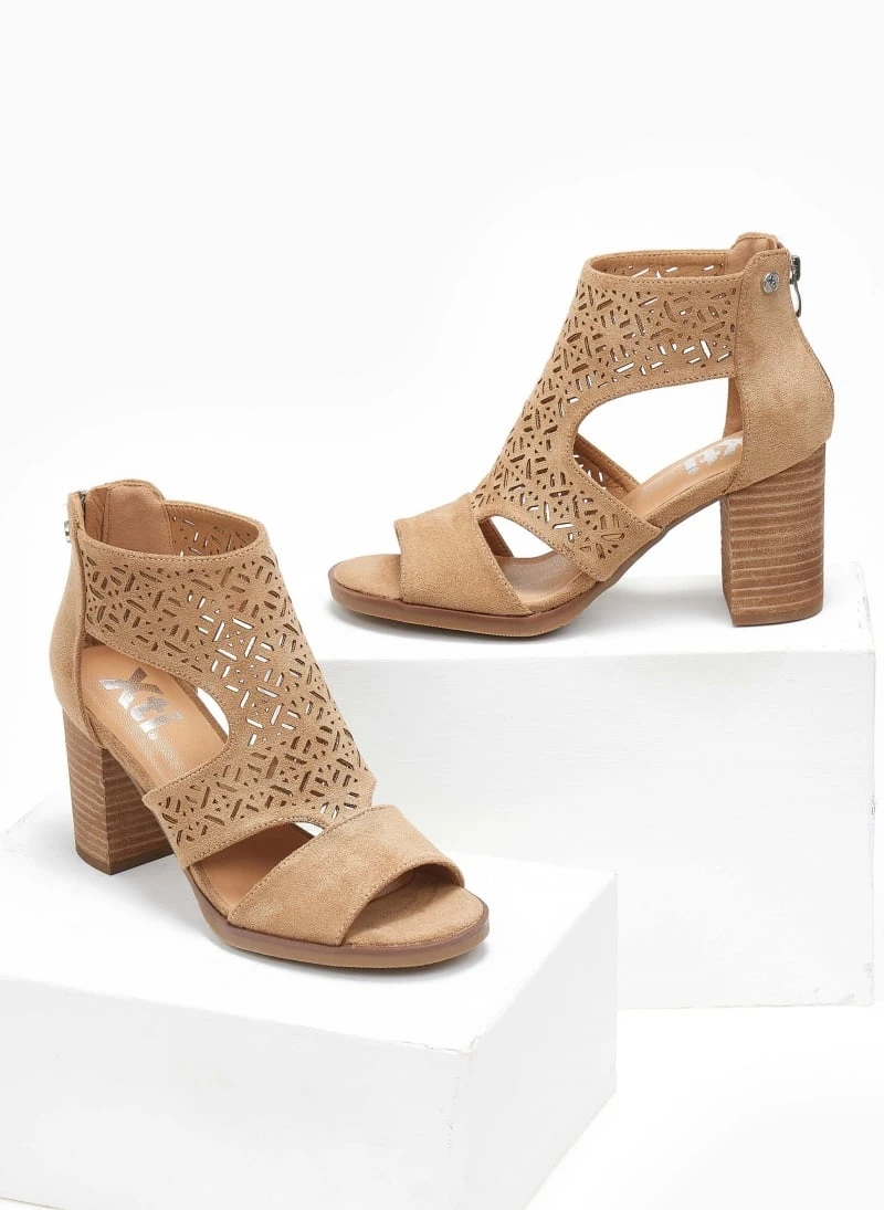 Πέδιλα suede με χωστό διάτρητο σχέδιο και ανοίγματα στο πλάι Xti. Έχουν ξύλινο χοντρό τακούνι. Κλείνουν με φερμουάρ στο πίσω μέρος. Διακριτικό μεταλλικό λογότυπο στο πλάι. Peta vegan approved.